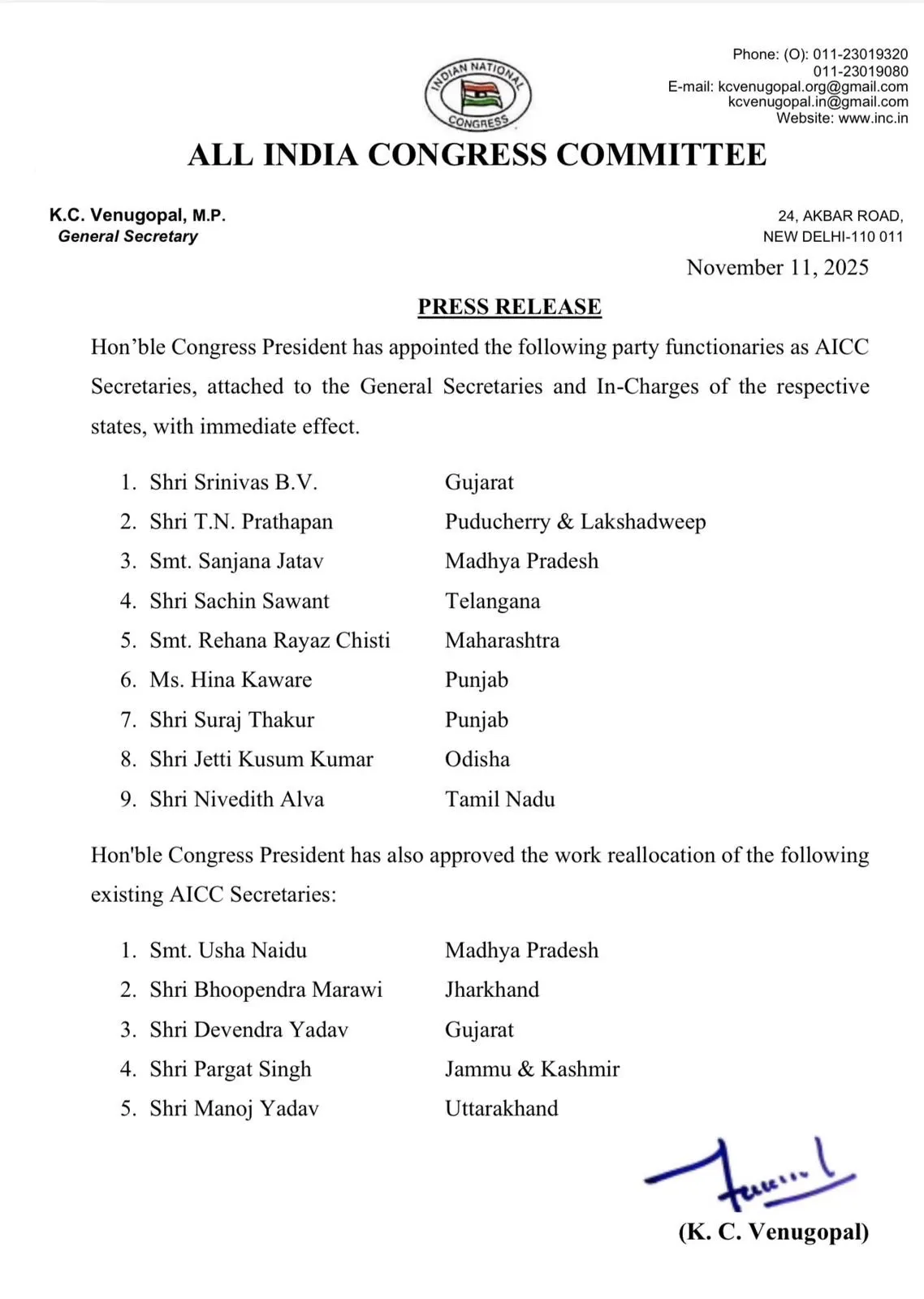 कांग्रेस महासचिव के.सी. वेणुगोपाल ने नई नियुक्तियों में गुजरात, तमिलनाडु, ओडिशा, महाराष्ट्र, पंजाब, तेलंगाना और पुडुचेरी के लिए भी नए सचिवों की घोषणा की गई है। पार्टी ने कहा कि इन बदलावों का उद्देश्य संगठन को और मजबूत बनाना है, ताकि आने वाले चुनावों में बेहतर प्रदर्शन किया जा सके।