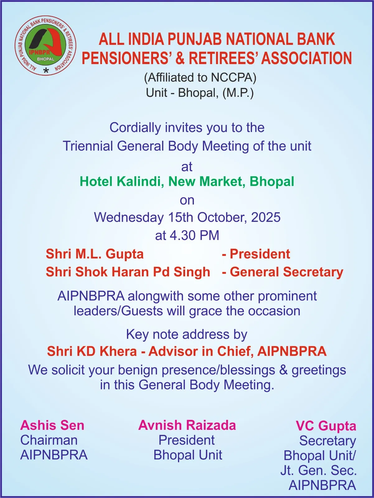 AIPNBPRA: ऑल इंडिया पंजाब नेशनल बैंक पेंशनर्स एंड रिटायरीज एसोसिएशन भोपाल यूनिट की 15 अक्टूबर को जनरल बॉडी मीटिंग