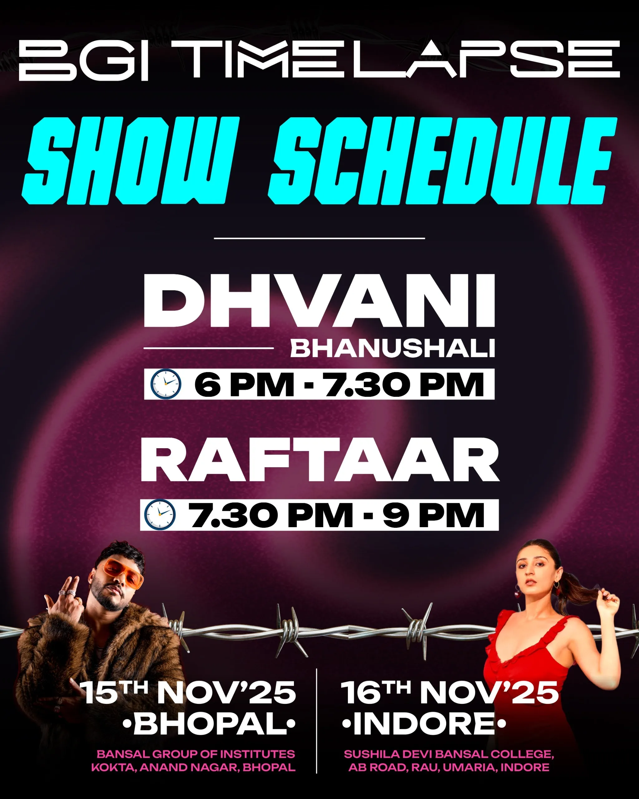 यह कार्यक्रम सिर्फ भोपाल में ही नहीं है। टाइमलैप्स 2025 का दूसरा शो 16 नवंबर को इंदौर में होगा, जहां वही कलाकार अपने परफॉर्मेंस के साथ कॉलेज के युवाओं को उत्साहित करेंगे।