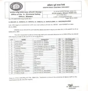 CRS मिश्रा अब 6 और 7 नवंबर को बिलासपुर DRM कार्यालय (Bilaspur DRM Office) में पूछताछ करेंगे। इस जांच में रेलवे के 19 अफसरों और कर्मचारियों को आवश्यक दस्तावेजों के साथ बुलाया गया है।