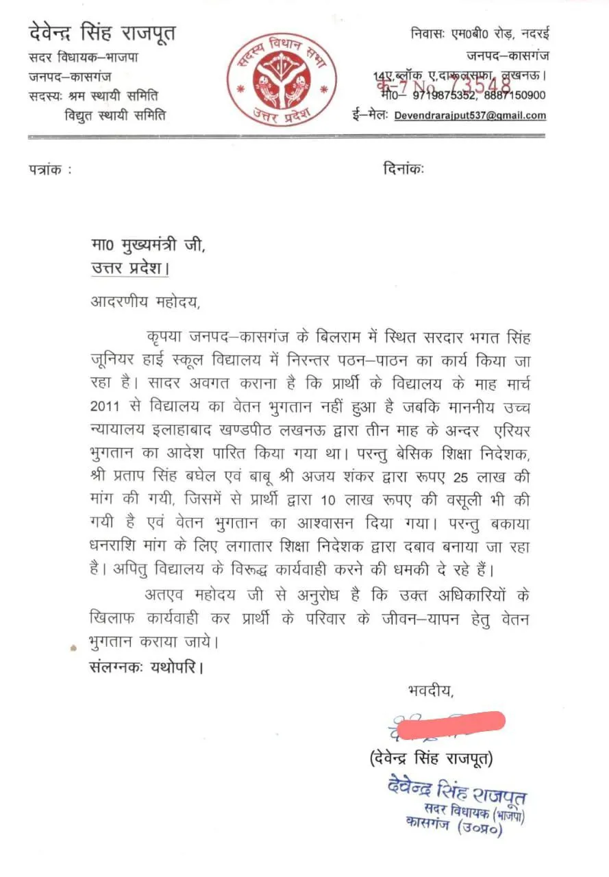 पत्र में भाजपा विधायक देवेंद्र सिंह राजपूत ने मुख्यमंत्री योगी आदित्यनाथ से आग्रह किया है कि बेसिक शिक्षा निदेशक प्रताप सिंह बघेल और बाबू अजय शंकर के खिलाफ कड़ी कार्रवाई की जाए। साथ ही, कासगंज के विद्यालय के कर्मचारियों का 2011 से लंबित बकाया वेतन (Pending Salary of Teachers) तुरंत जारी करने की मांग की है, ताकि शिक्षकों और उनके परिवारों का जीवन-यापन सुचारु रूप से हो सके।