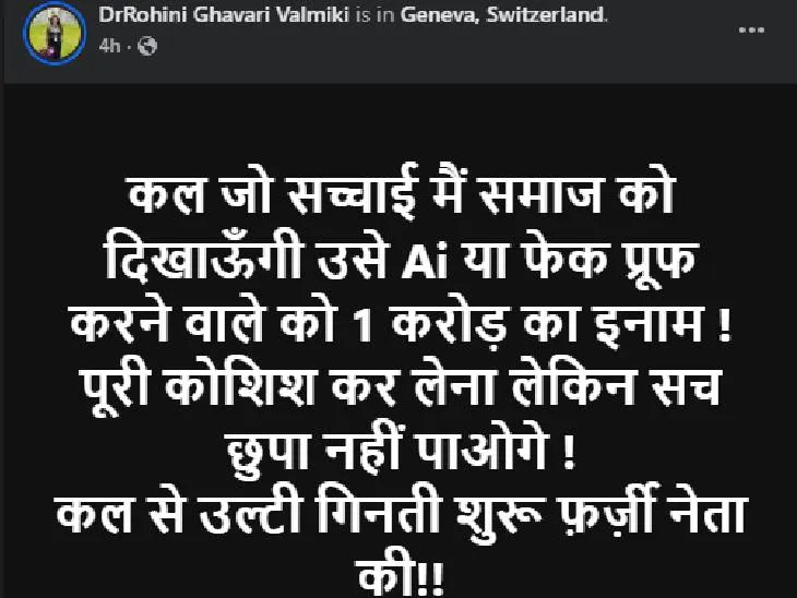 जिसमें उन्होंने कहा है कि जो भी उनकी बताई गई बातें AI या फेक साबित कर दे, उसे वे ₹1 करोड़ इनाम में देंगी। रोहिणी, जो दावा करती हैं कि उन्हें नगीना से सांसद चंद्रशेखर आजाद रावण से पीड़ित किया गया, ने गुरुवार को एक के बाद एक दो पोस्ट प्रकाशित कर कहा कि वे सार्वजनिक रूप से कुछ महत्वपूर्ण सच्चाइयाँ उजागर करने वाली हैं और इसके लिए उल्टी गिनती भी शुरू कर दी है।