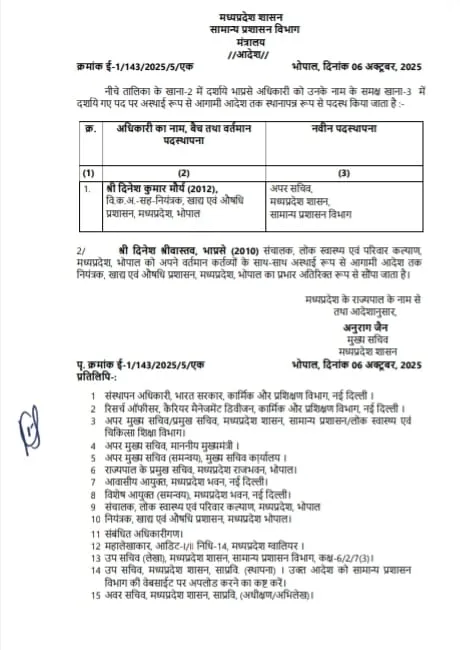 MP New Drug Controller: छिंदवाड़ा में हुए कफ सिरप कांड के बाद ड्रग कंट्रोलर दिनेश मौर्य को हटा दिया गया है। दिनेश श्रीवास्तव को नया ड्रग कंट्रोलर बनाया गया है। आदेश जारी हो गया है।