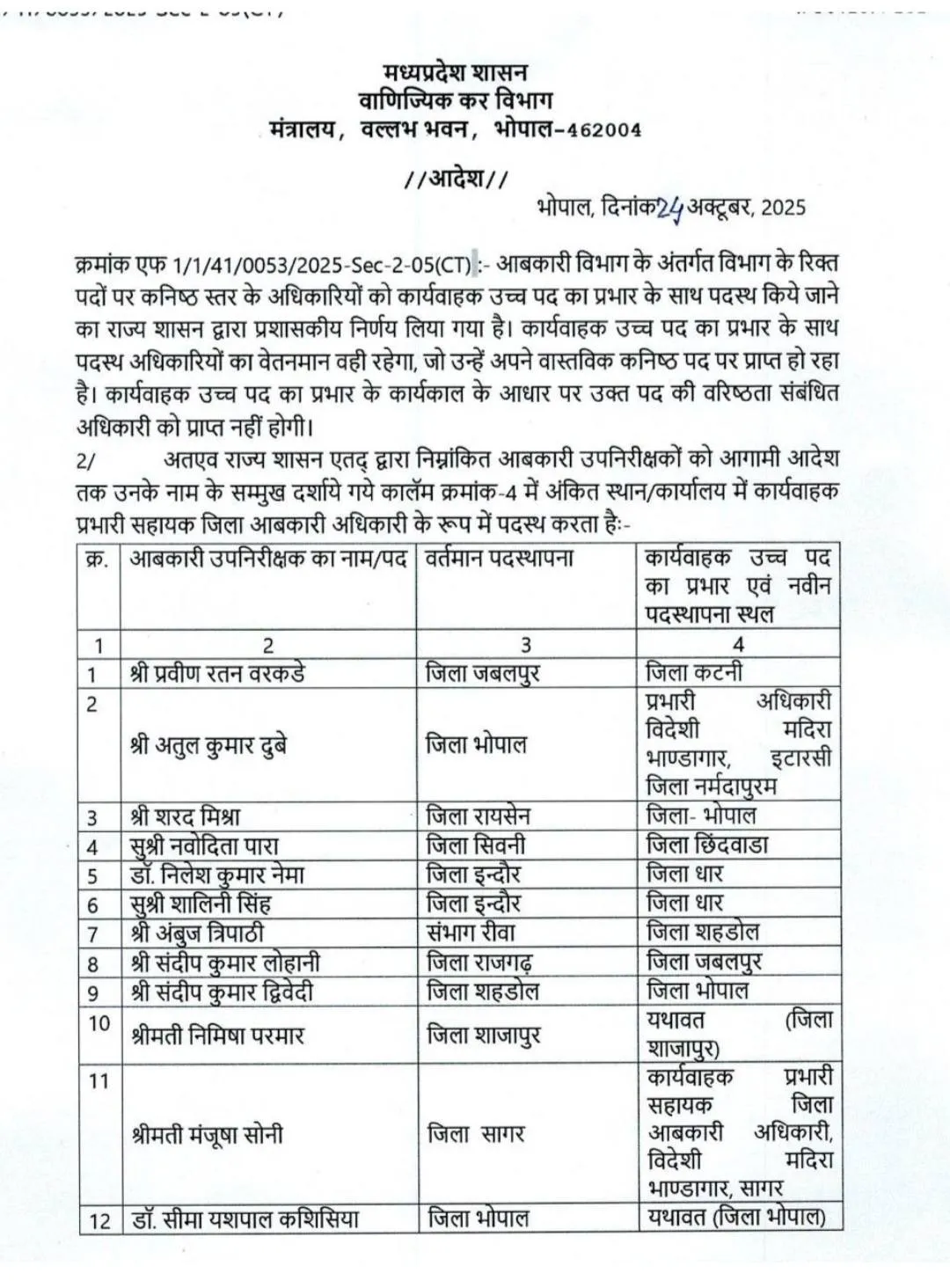 MP Excise Officer Transfer: मध्यप्रदेश सरकार ने आबकारी विभाग में 59 अधिकारियों के प्रभार में बदलाव किया हैं। नए आदेश के तहत रिक्त पदों पर जूनियर स्तर के अधिकारियों को कार्यवाहक उच्च पद का प्रभार सौंपा गया है।