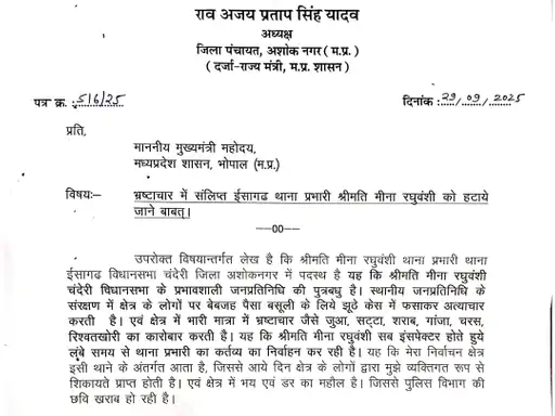 दरअसल, अशोकनगर जिला पंचायत अध्यक्ष अजय प्रताप सिंह यादव ने ईसागढ़ थाना प्रभारी मीना रघुवंशी के खिलाफ मोर्चा खोल दिया है। उन्होंने सोमवार को मुख्यमंत्री डॉ. मोहन यादव को एक पत्र लिखकर ईसागढ़ थाना प्रभारी मीना रघुवंशी को पद से हटाने की मांग की।