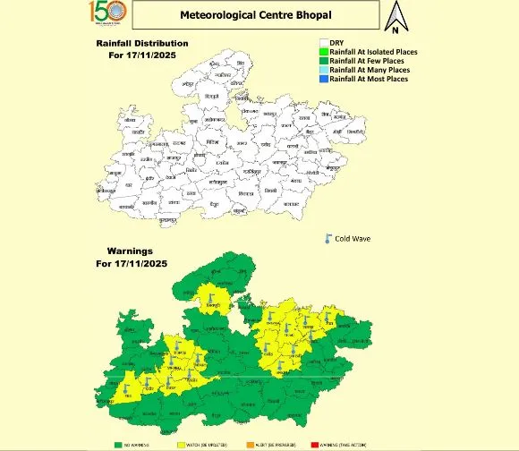 राज्य के सभी संभागों में पिछले एक दिन में कहीं भी बारिश नहीं हुई। मौसम साफ रहा, लेकिन ठंडी हवा की वजह से कई जिलों में शीत लहर महसूस की गई। धार, नौगांव, दमोह, शिवपुरी और बैतूल में शीत लहर का असर दिखा। भोपाल, राजगढ़, इंदौर, रीवा, जबलपुर, सीहोर, शाजापुर और शहडोल में ठंड और ज्यादा कड़ी रही। मलाजखंड में दिन के समय भी ठंड बनी रही।