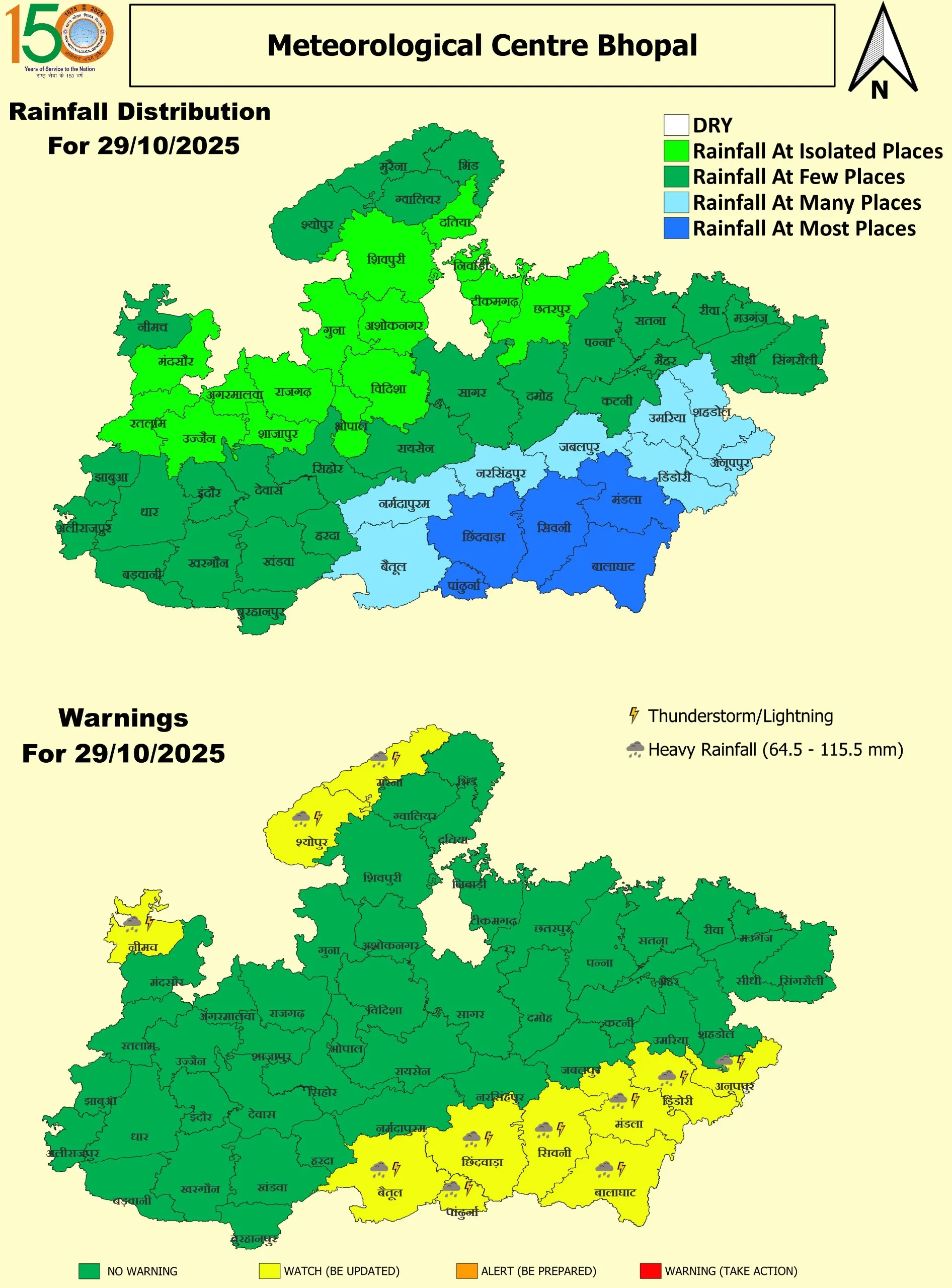 गुरुवार, 30 अक्टूबर 2025: प्रदेश के छह जिलों में अति भारी और 12 जिलों में भारी बारिश की चेतावनी जारी की गई है। जिन जिलों में अति भारी बारिश होना हैं, उनमें सतना, रीवा, मउगंज, सीधी, सिंगरौली, शहडोल, अनूपपुर शामिल हैं। जबकि झाबुआ, अलीराजपुर, बड़वानी, पन्ना, दमोह, कटनी, मैहर, उमरिया, जबलपुर, डिंडोरी, मंडला, सिवनी, छिंदवाड़ा, बालाघाट में भारी बारिश होने का अनुमान है।