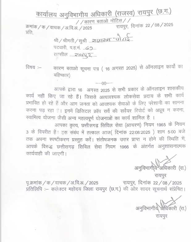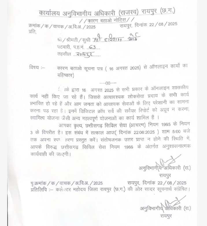 रायपुर में पटवारियों ने ऑनलाइन कामकाज ठप किया: एसडीएम ने जारी किया कारण बताओ नोटिस, अनुशासनात्मक कार्रवाई की चेतावनी