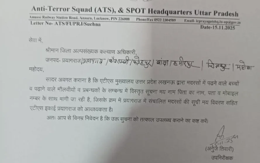 UP ATS Action: दिल्ली में हुए आतंकी हमले के बाद उत्तर प्रदेश एटीएस ने सुरक्षा को लेकर बड़ा कदम उठाया है। प्रयागराज, प्रतापगढ़, कौशांबी, फतेहपुर, बांदा, हमीरपुर, महोबा और चित्रकूट के मदरसों से छात्रों और मौलवियों की सूचनाएं मांगी गई हैं। एजेंसियों का कहना है कि यह कार्रवाई केवल सुरक्षा मूल्यांकन की प्रक्रिया है, ताकि किसी भी संदिग्ध गतिविधि को समय रहते रोका जा सके।