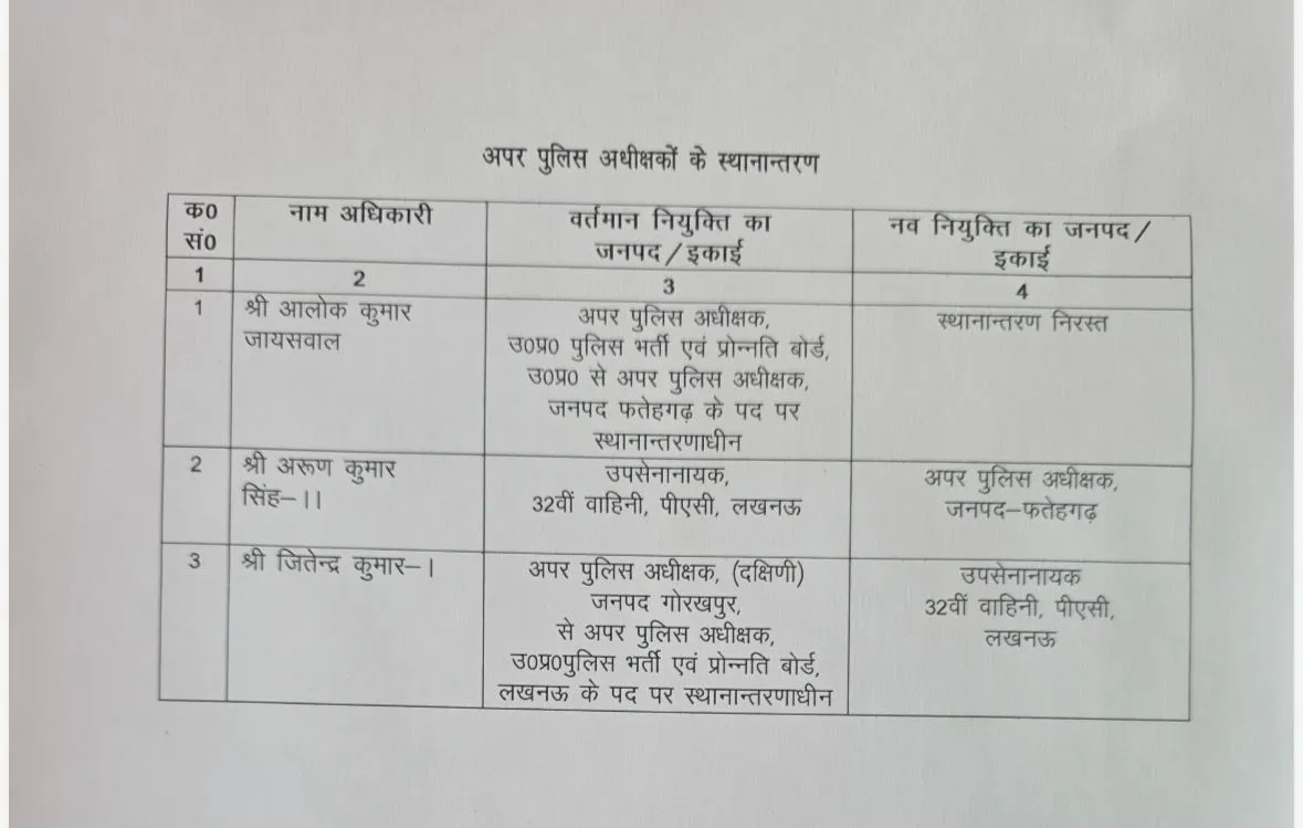 ताज़ा आदेश के अनुसार, तीन प्रमुख PPS अधिकारियों की नियुक्तियों और स्थानों में बदलाव किया गया है। यह फेरबदल प्रदेश के पुलिस प्रशासन में नई व्यवस्था और कार्यकुशलता लाने के उद्देश्य से किया गया है।